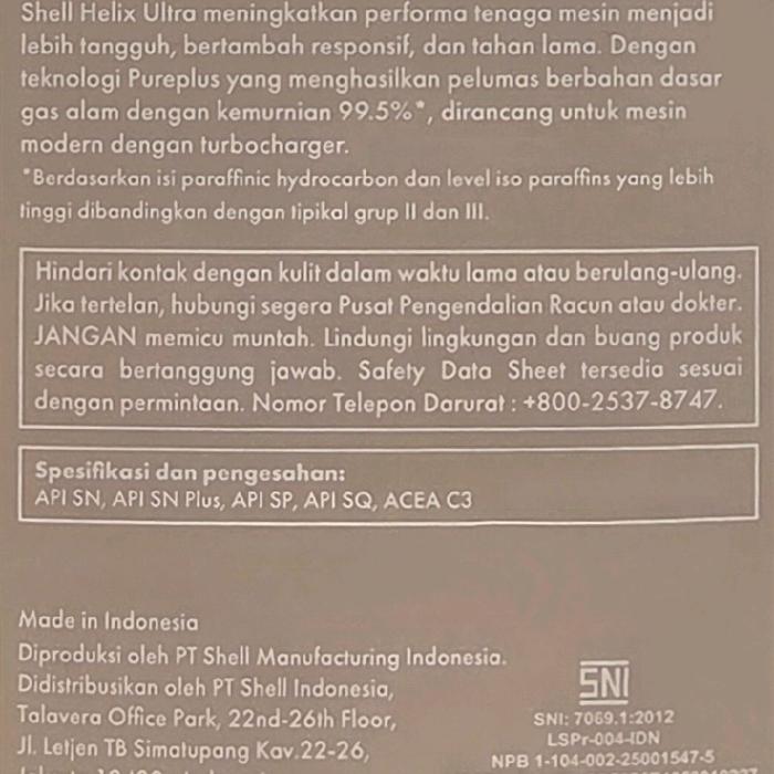 Shell Helix Ultra ECT 5W-30 adalah pelumas mesin mobil full sintetis dengan teknology Pureplus yaitu berbahan dasar gas alam murni yang diubah menjadi oli untuk performa, pembersihan, dan perlindungan mesin tanpa henti. Sebagai pelumas yang dapat membantu mesin mobil agar tetap bersih dan terlindungi, Shell Helix Ultra ECT 5W-30 membantu mencegah endapan yang dapat mengurangi performa mesin Anda, serta membantu mengurangi gesekan mesin untuk menurunkan konsumsi bahan bakar. Shell Helix Ultra ECT 5W-30 pun dilengkapi dengan Pure Plus Technology, yakni terbuat dari bahan dasar gas alam yang menghasilkan molekul yang aktif bekerja ketika mesin mengalami tekanan/temperatur tinggi, serta molekul yang membentuk lapisan pelindung tahan lama dan menyeluruh pada permukaan logam bagian dalam mesin.