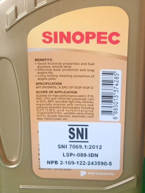 SINOPEC JUSTAR J500 5W30 API SN 1 LITER