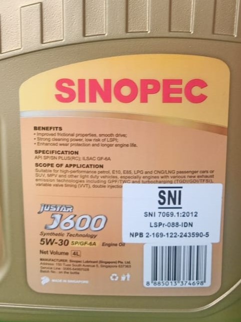Be the first to review “SINOPEC JUSTAR J600 5W30 – Kemasan Galon isi 4 LITER”